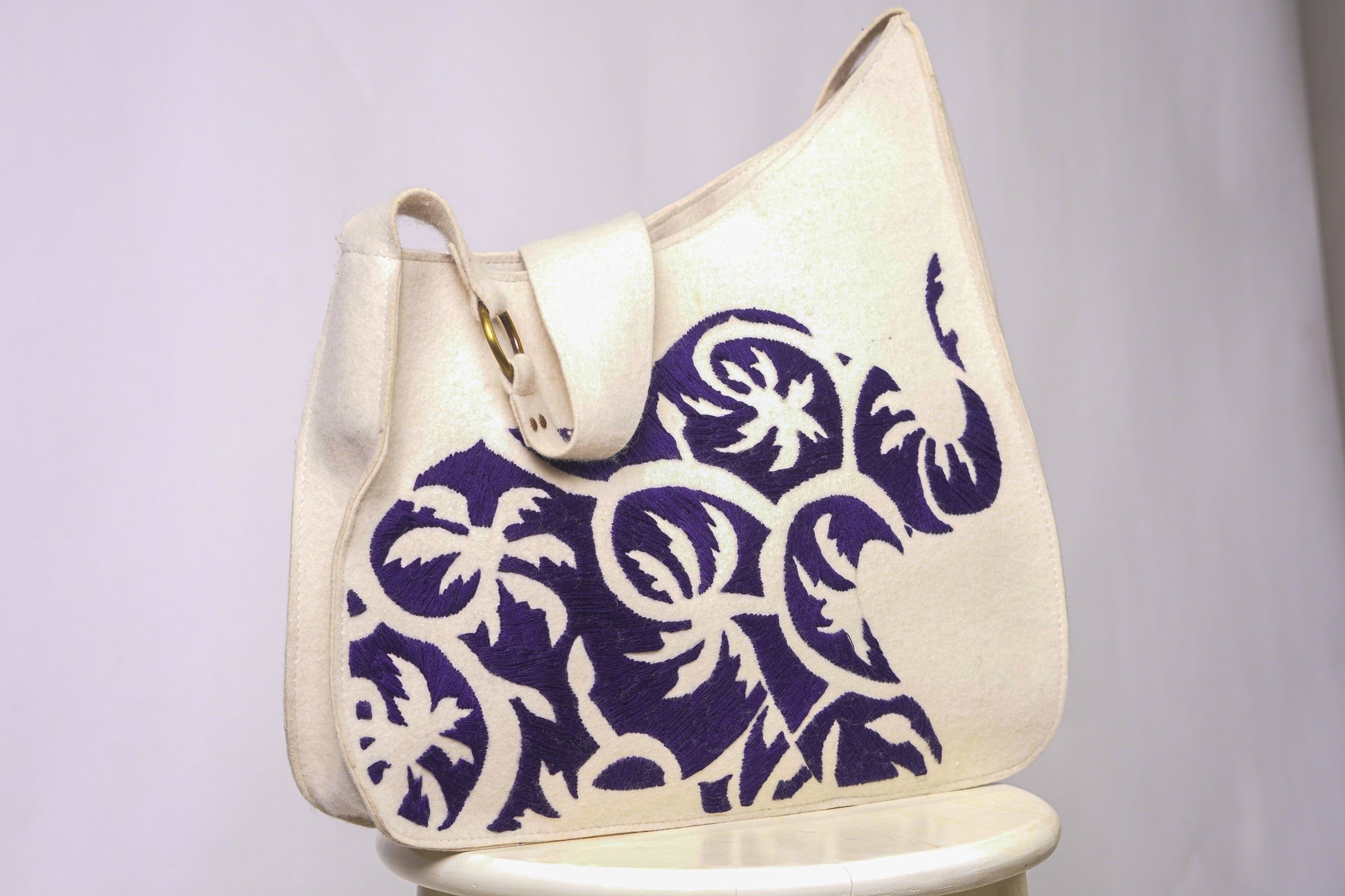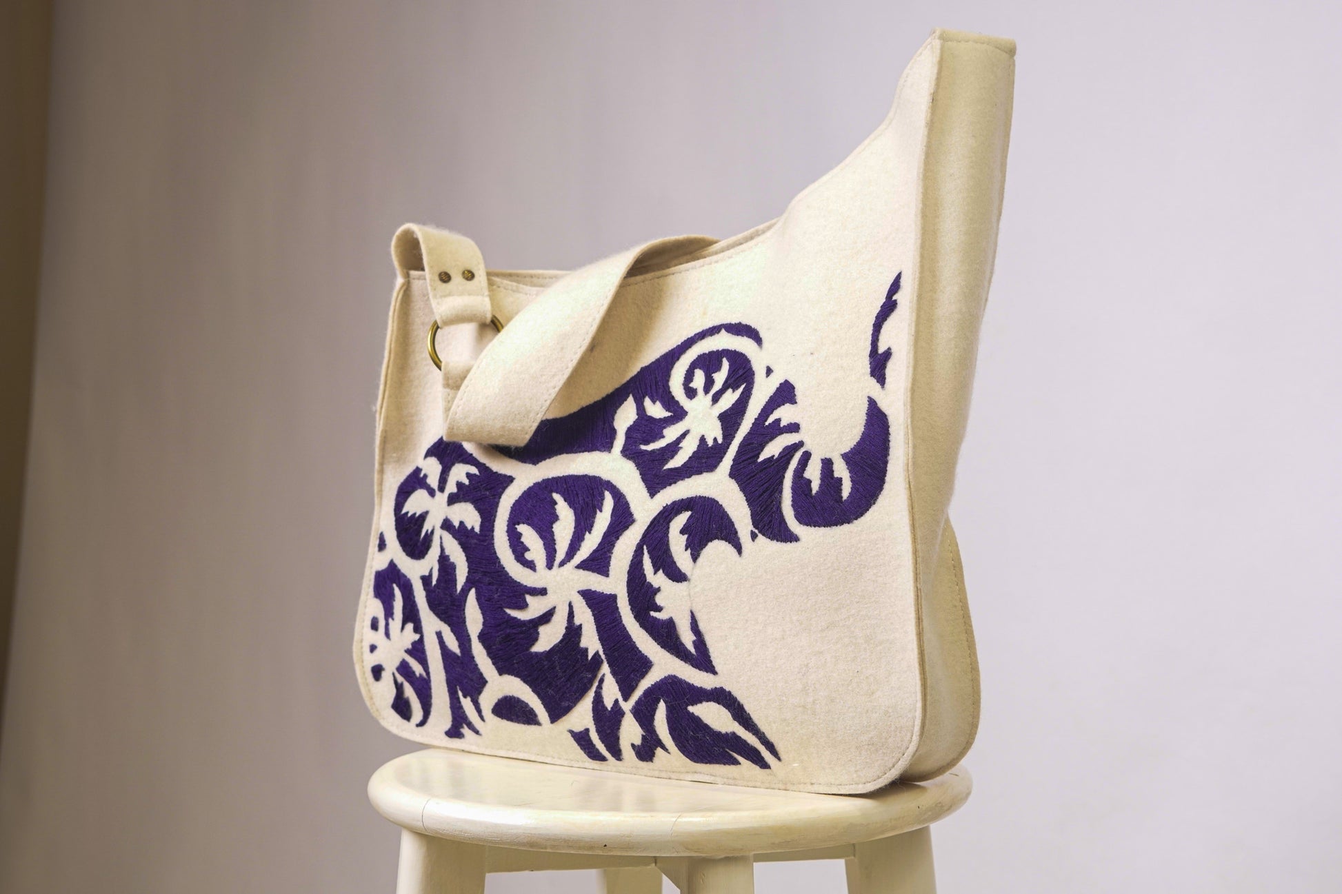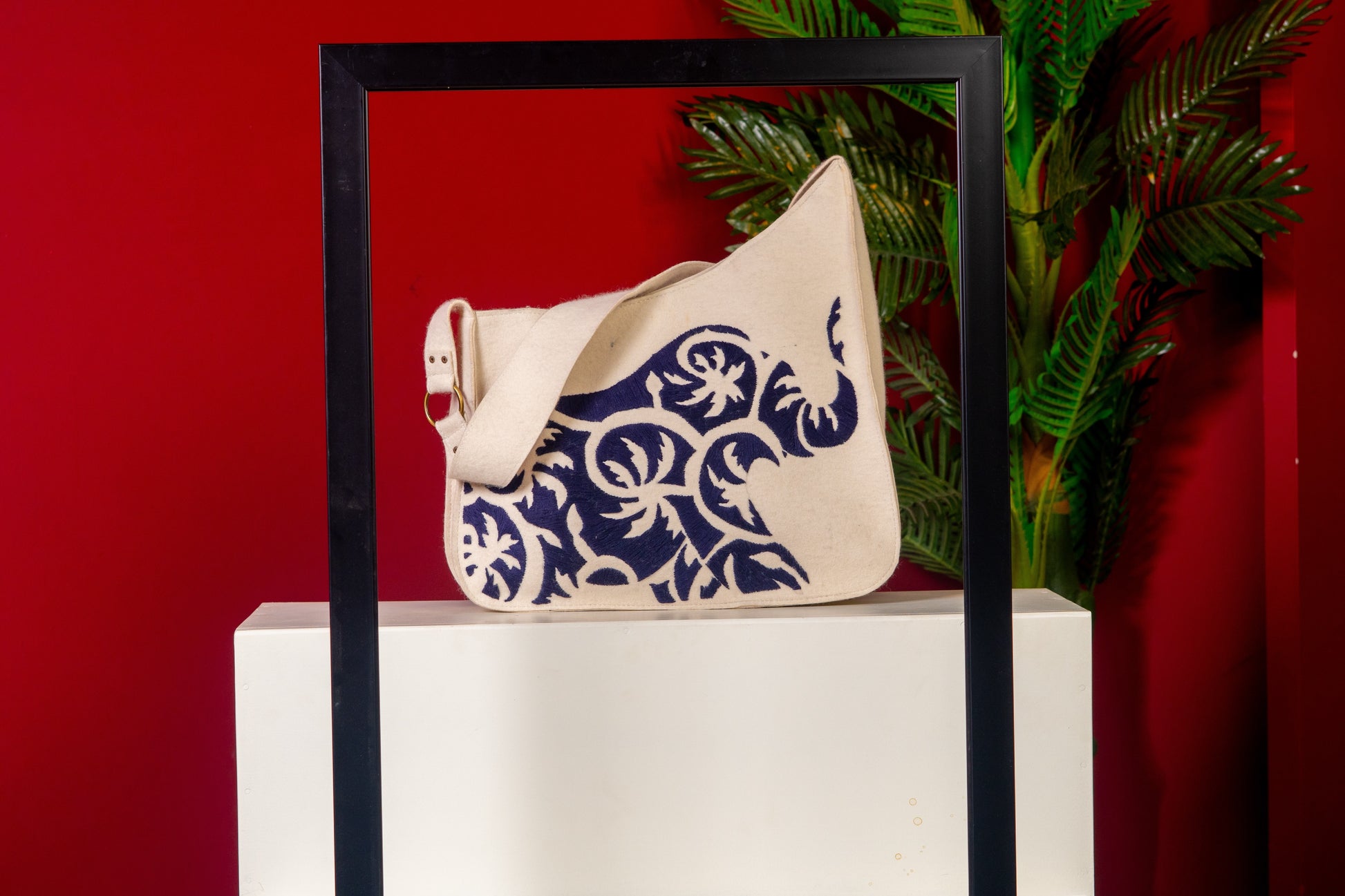 Inspired by the timeless Indian motif of the elephant — a symbol of wisdom, protection, and prosperity — Gaja blends heritage storytelling with modern functionality. The bag features an intricate hand-woven pattern in deep navy, forming an abstract elephant silhouette that wraps gracefully across the surface. The contrast between the natural wool base and the bold patterning gives the piece a striking yet refined presence.