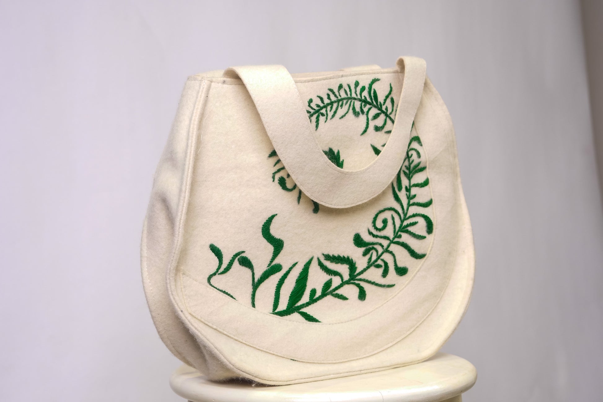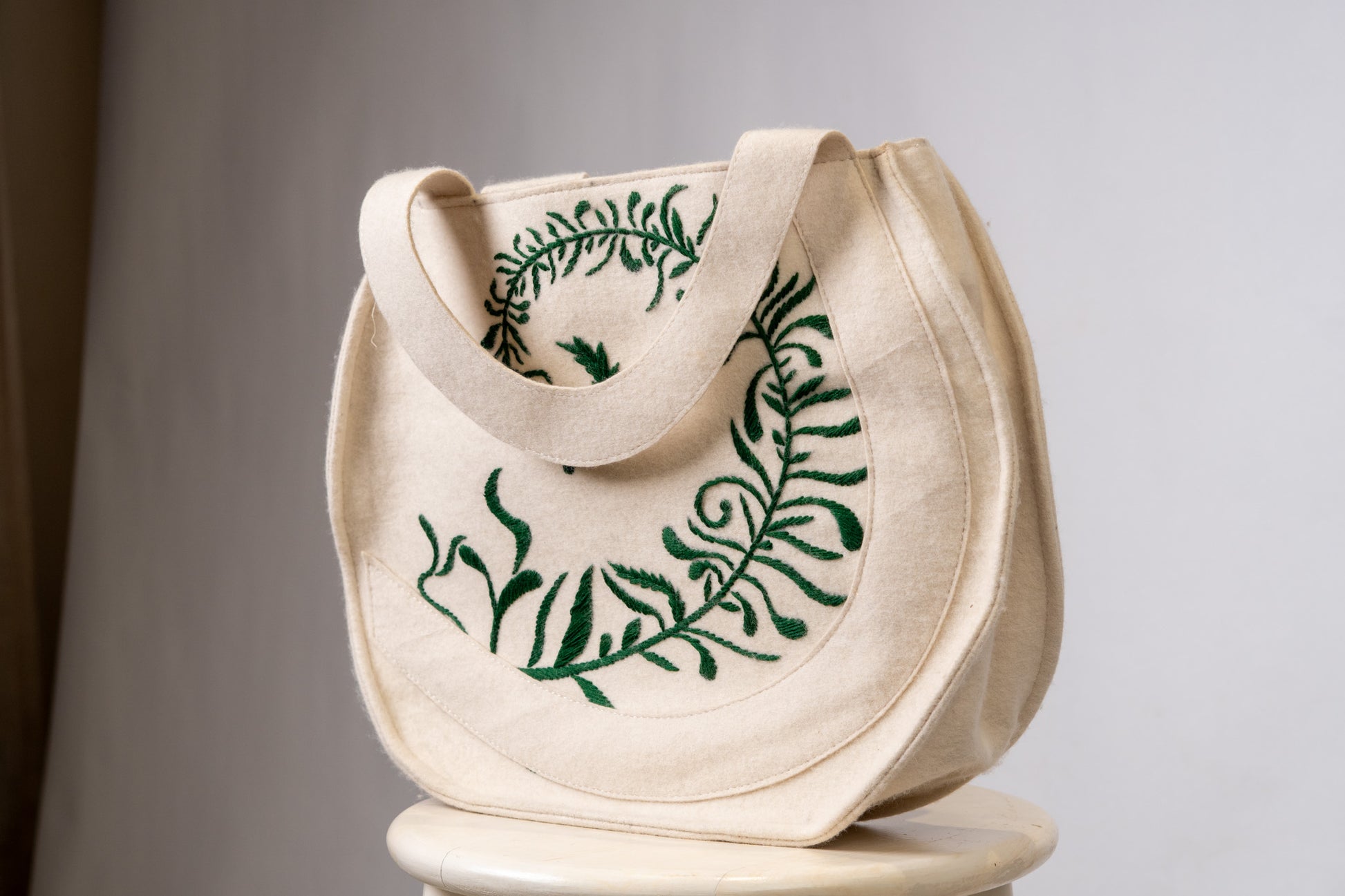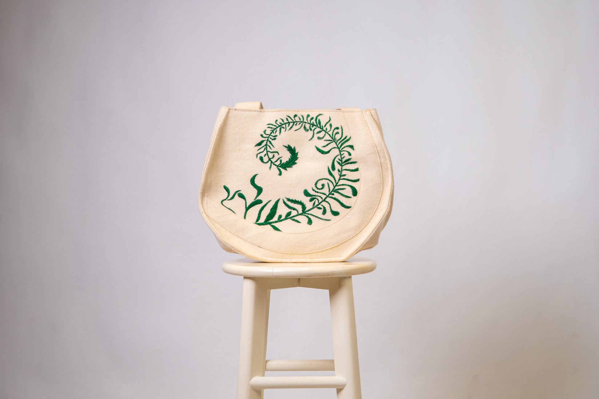 Inspired by the poetry of natural forms, Palkinī features an elegant crescent-like silhouette framed by sweeping embroidered vines. The detailed green stitching spirals across the felt in rhythmic motion, giving the bag a sense of life and continuity — art that grows across the surface.